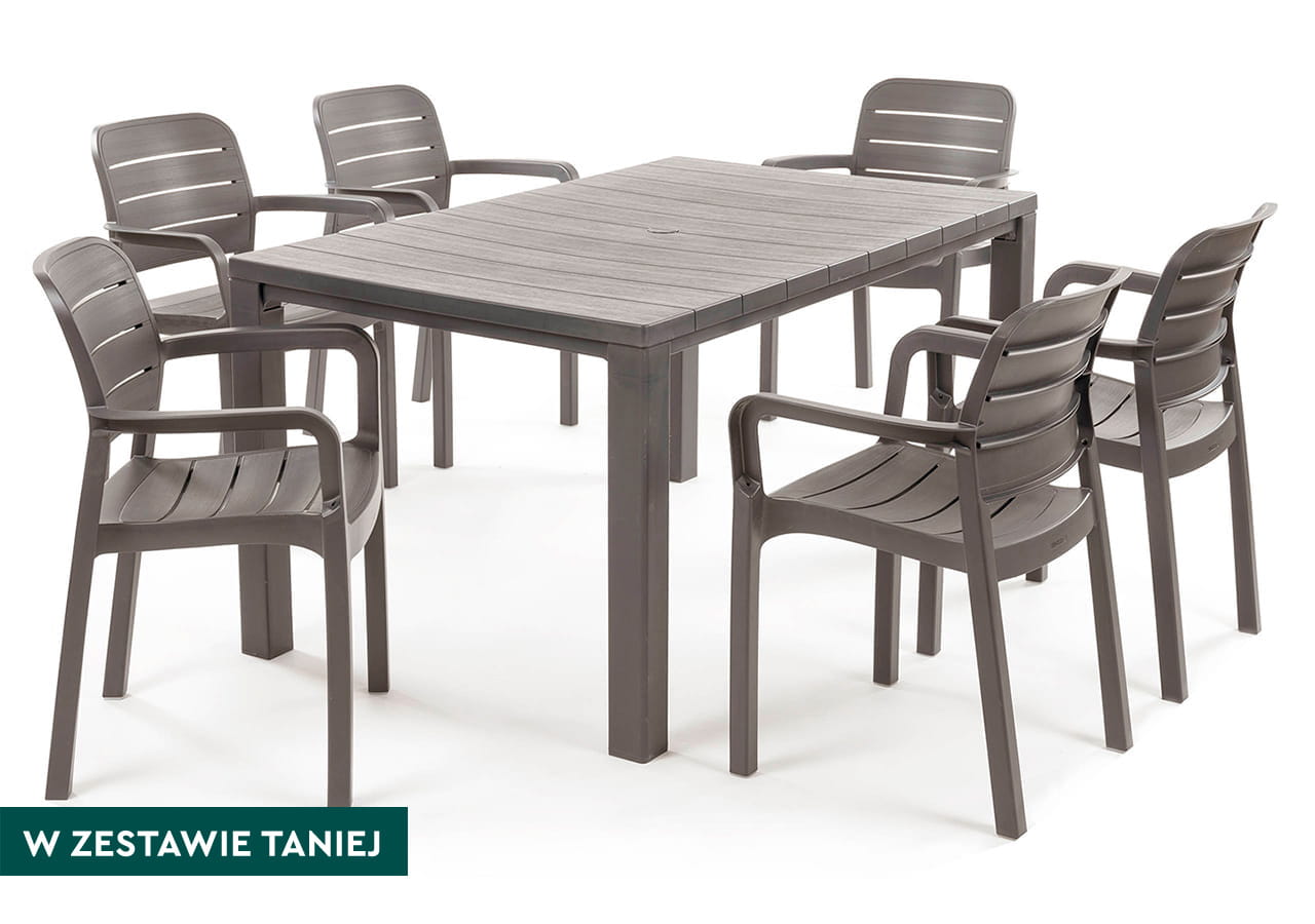 Oferujemy elegancki zestaw składający się z 6 krzeseł Tisara oraz stołu Julie, idealny do jadalni i ogrodu.